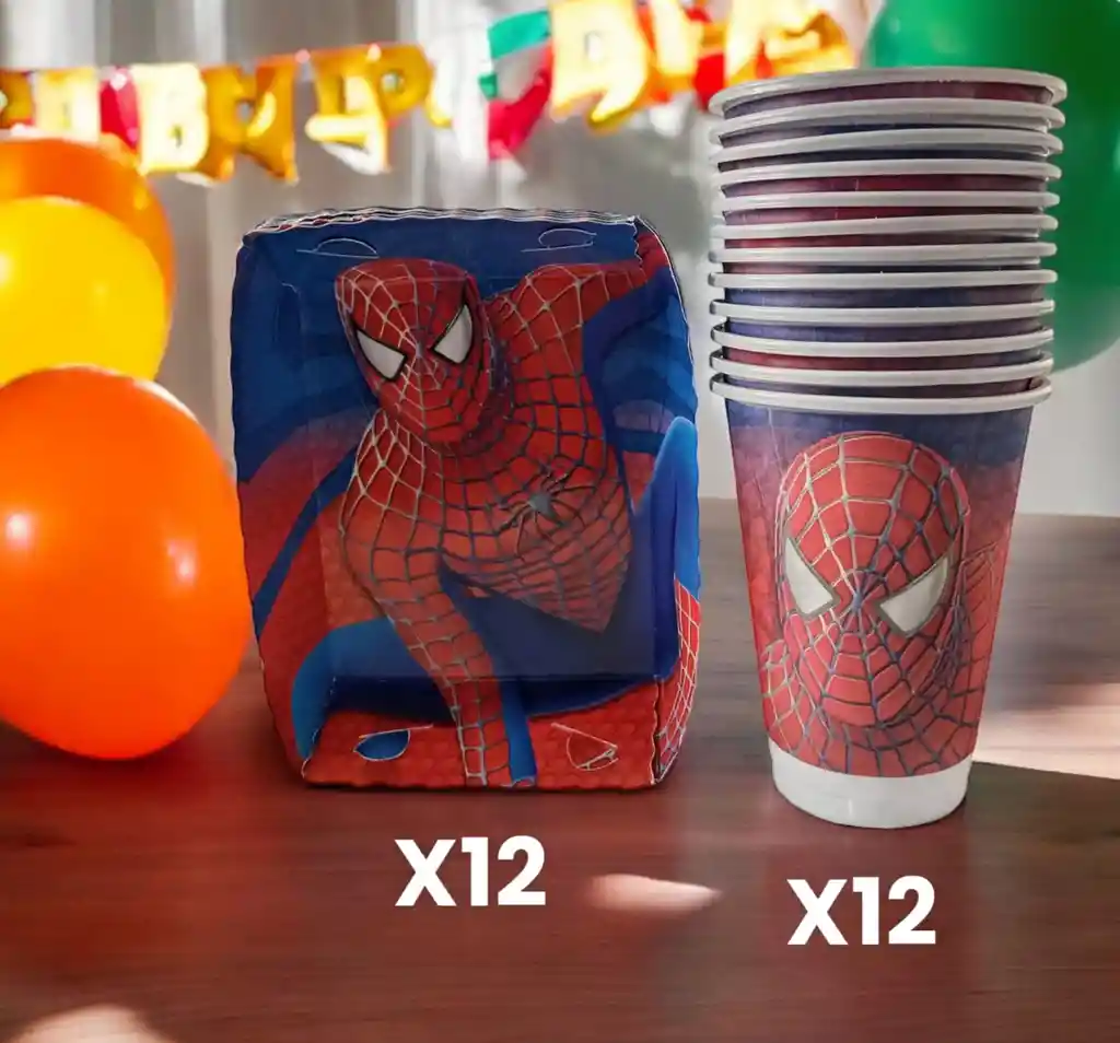 Por la compra llevas: •12 Torteros Hombre Araña (Para servir la torta, Postre o Snack) •12 Vasos Hombre Araña