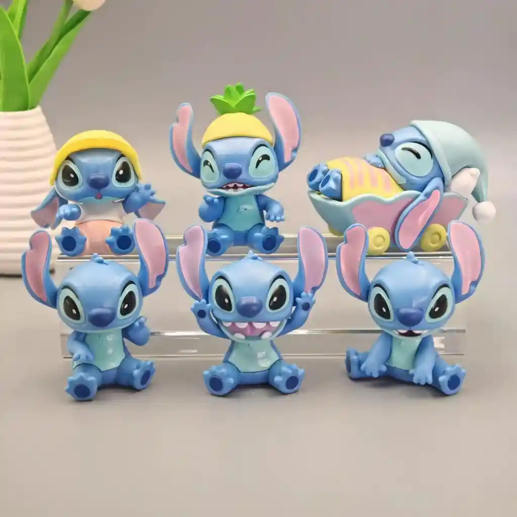Material: PVC Incluye: 6x Figuras de colección Stitch. Importante: Debido a la diferencia de pantallas y efecto de la luz, el color real del artículo puede ser ligeramente diferente al color mostrado en las imágenes.