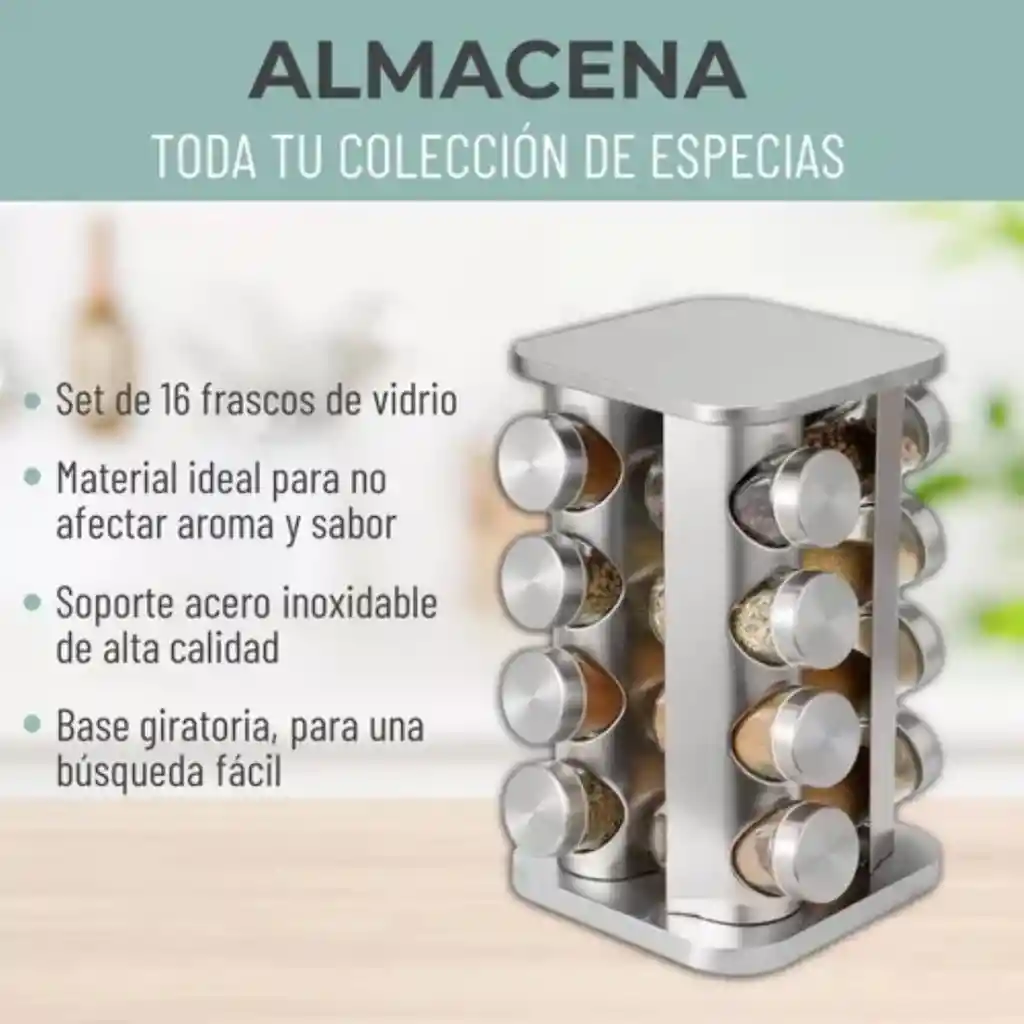 Especiero 16 Frascos Redondo Garageimpo Giratorio Acero Inoxidable Cocina ### Especiero Giratorio de Acero Inoxidable con 16 Frascos **Descripción:** Este práctico especiero es ideal para mantener todas tus especias organizadas en un solo lugar, aportando además un toque decorativo a tu cocina. Con una estructura giratoria de acero inoxidable, permite acceder fácilmente a los 16 frascos de vidrio incluidos. **Características Principales:** 1. **Diseño Elegante y Funcional**: Su estructura de acero inoxidable no solo es duradera y resistente, sino que también añade un toque moderno y elegante a cualquier cocina. 2. **Base Giratoria**: La base giratoria facilita el acceso a cualquiera de los frascos de manera rápida y eficiente, lo que mejora la experiencia en la cocina. 3. **16 Frascos de Vidrio**: Incluye 16 frascos de vidrio, cada uno con tapa de acero inoxidable y una tapa perforada de plástico para verter las especias fácilmente. Cada frasco tiene una capacidad de 100 ml, perfecta para almacenar una variedad de especias. 4. **Medidas**: - **Especiero**: Diámetro de 22,5 cm x Altura de 28,5 cm. - **Frascos**: Altura de 10 cm x Diámetro de 4 cm. - **Capacidad de los frascos**: 100 ml cada uno. **Beneficios:** - **Organización eficiente**: Mantiene todas tus especias en un solo lugar, facilitando su uso durante la cocción. - **Acceso rápido**: La base giratoria permite alcanzar cualquier frasco con facilidad. - **Diseño moderno**: Ideal para decorar la cocina y añadir un toque elegante. Este especiero giratorio es el accesorio perfecto para cualquier amante de la cocina que busca practicidad, organización y estilo.