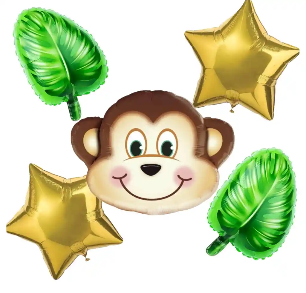 Set de globo, contiene: 1 globo metalizado mico, 2 globos metalizados hoja verde, 2 globo estrella dorada de 18", lo puedes usar para cumpleaños, Decoraciones, celebraciones de animales de la selva, fiestas infantiles, happy borthday, Medellín