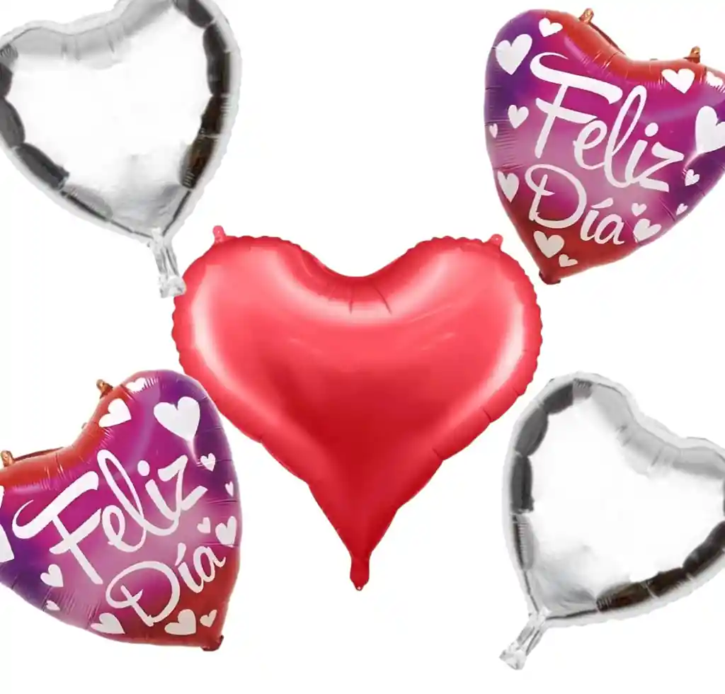 Contiene: 1 Globo Metalizado Corazón rojo 22 Pulgadas,2 Globo Metalizado Corazón Feliz Día, 2 Globo Metalizado Corazón Plateado, Para Decorar Fiestas, Cumpleaños, San Valentín, Aniversario