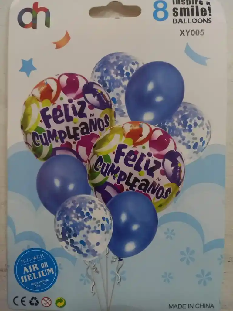 SET DE 8 GLOBOS CONTIENE: 6 GLOBOS DE LÁTEX R12 (25X25cms APROX): 3 AZULES SATINADOS Y 3 CRISTAL CON CONFETTIS 2 GLOBOS METALIZADOS DE 18" (45X45CMS APROX) ESTAMPADOS DE FELIZ CUMPLEAÑOS IDEALES PARA INFLAR CON HELIO O PARA COMPLEMENTAR TUS DECORACIONES.