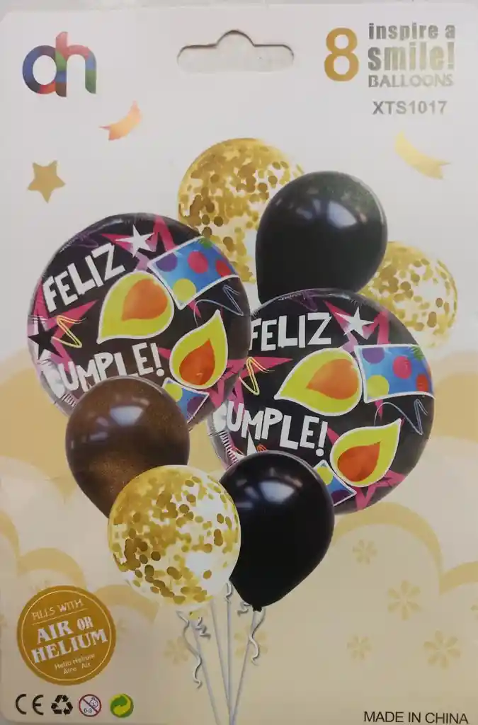 SET DE 8 GLOBOS CONTIENE: 6 GLOBOS DE LÁTEX R12 (25X25cms APROX): 3 NEGROS SATINADOS Y 3 CRISTAL CON CONFETTIS 2 GLOBOS METALIZADOS DE 18" (45X45CMS APROX) ESTAMPADOS DE FELIZ CUMPLEAÑOS IDEALES PARA INFLAR CON HELIO O PARA COMPLEMENTAR TUS DECORACIONES.