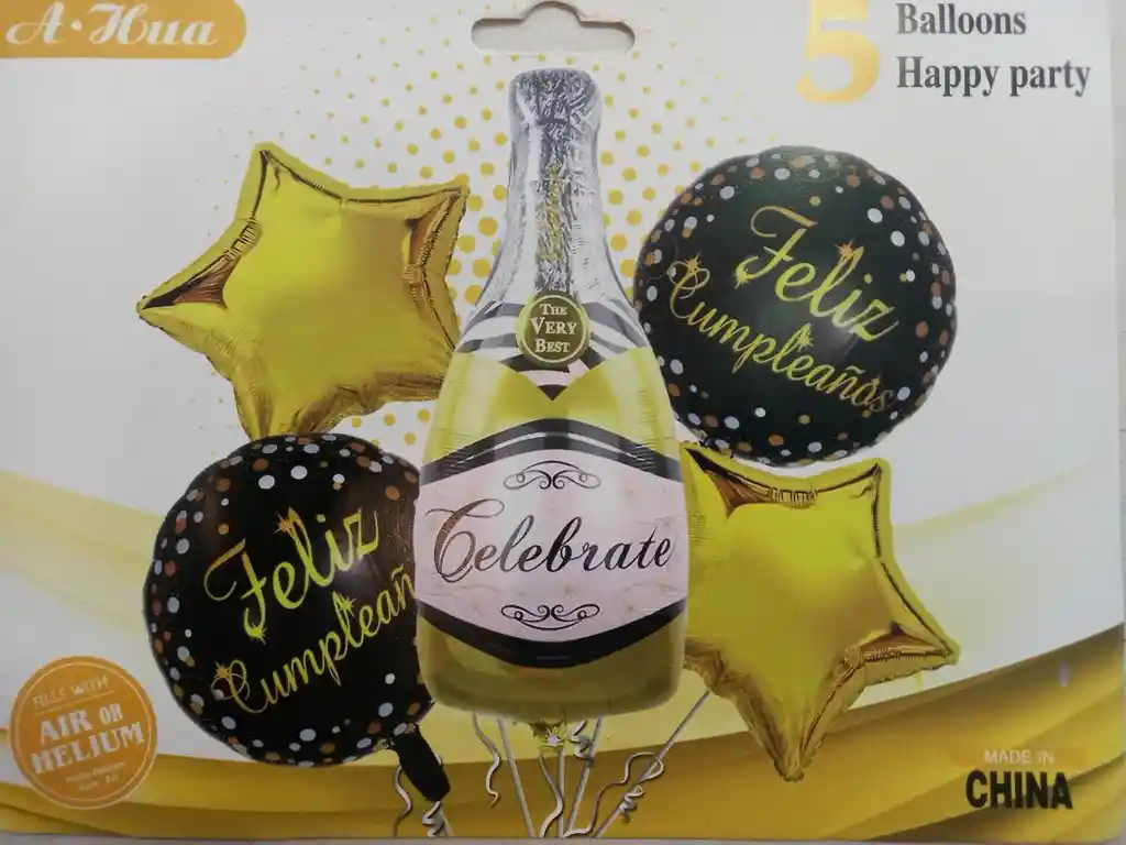 SET DE 5 GLOBOS CONTIENE: 2 GLOBOS METALIZADOS DE 18" (45X45CMS APROX) ESTAMPADOS DE FELIZ CUMPLEAÑOS 2 GLOBOS METALIZADOS DE 18" (45X45CMS APROX) EN FORMA DE ESTRELLA 1 CHAMPAÑA METALIZADA (100X40CMS APROX) IDEALES PARA INFLAR CON HELIO O PARA COMPLEMENTAR TUS DECORACIONES.