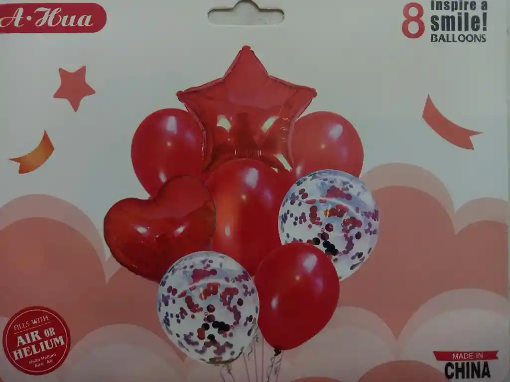 SET DE 8 GLOBOS CONTIENE: 6 GLOBOS DE LÁTEX R12 (25X25cms APROX): 4 ROJOS SATINADOS Y 2 CRISTAL CON CONFETTIS 2 GLOBOS METALIZADOS DE 18" (45X45CMS APROX) EN FORMA DE CORAZON Y ESTRELLA IDEALES PARA INFLAR CON HELIO O PARA COMPLEMENTAR TUS DECORACIONES.