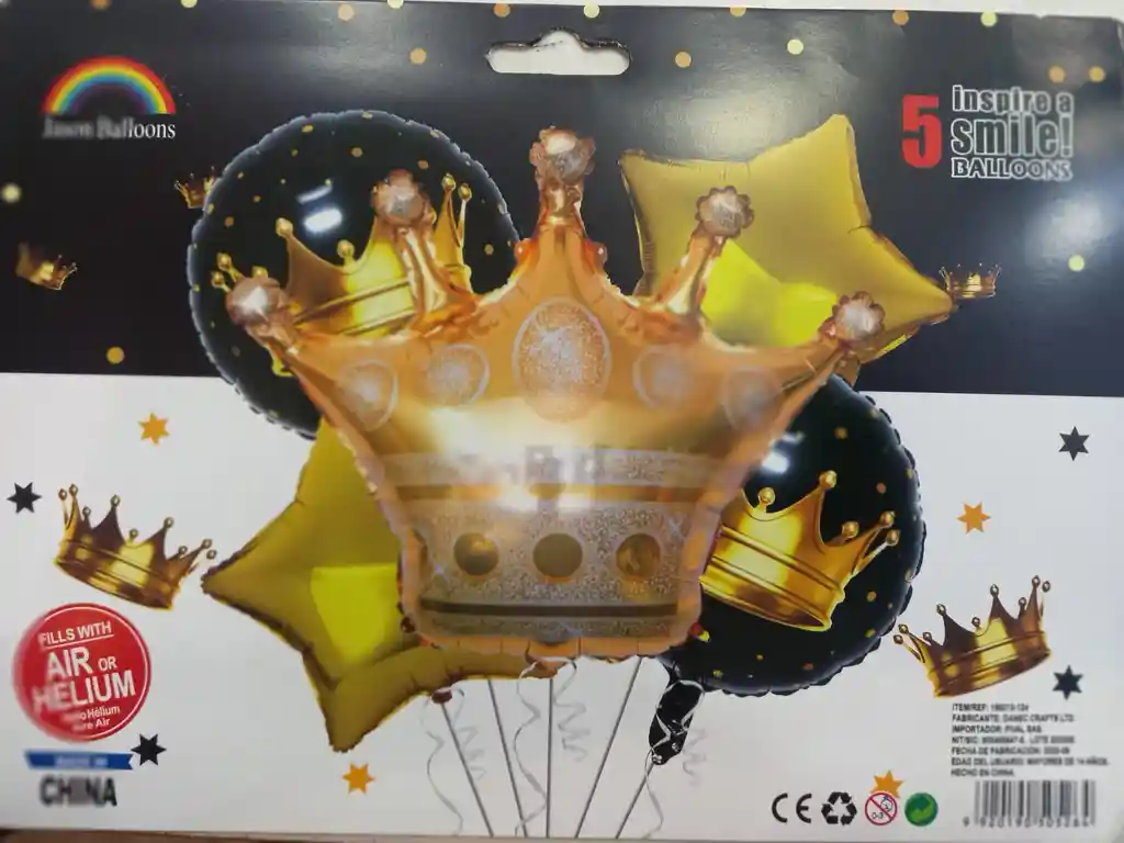 SET DE 5 GLOBOS CONTIENE: 2 GLOBOS METALIZADOS DE 18" (45X45CMS APROX) ESTAMPADOS CORONA 2 GLOBOS METALIZADOS DE 18" (45X45CMS APROX) EN FORMA DE ESTRELLA 1 CORONA METALIZADA (100X40CMS APROX) IDEALES PARA INFLAR CON HELIO O PARA COMPLEMENTAR TUS DECORACIONES.