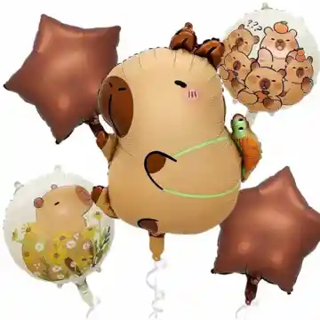 Decora tu celebración con este adorable set de globos de capibara. Incluye 5 piezas con diseños tiernos, ideales para cumpleaños, decoraciones temáticas y eventos especiales. Incluye: - 1 globo grande en forma de capibara - 2 globos en forma de estrella - 2 globos rendondos con estampado de capibara Composición: 1 00% emulsión Se puede inflar con aire o helio ¡Un detalle encantador para cualquier ocasión! 🎈 Nota: Los demás artículos que aparecen en imagen son solo para ambientar el producto, no están incluídos