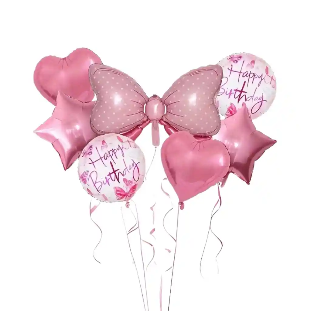 Este producto es un set de globos decorativos ideal para celebraciones de cumpleaños. El conjunto incluye diferentes formas y tamaños que aportan un toque festivo y elegante: 🎀 Globo principal en forma de lazo rosa con puntos blancos, de gran tamaño (48 cm de alto x 80 cm de ancho), perfecto como pieza central de la decoración. 💖 Globos en forma de corazón rosa, de 45 cm de alto, con un total de 2 unidades. ⭐ Globos en forma de estrella rosa, también de 45 cm de alto, con 2 unidades incluidas. 🎉 Globos redondos con mensaje “Happy Birthday” y detalles de mariposas rosas, de 45 cm de alto, con 2 unidades. En total, el set ofrece una combinación de 7 globos que mezclan formas llamativas y mensajes festivos, diseñados para crear un ambiente alegre y especial en cualquier cumpleaños.