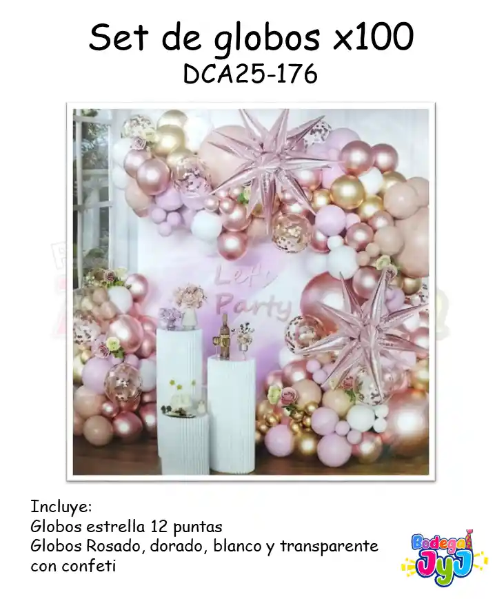 SET DE GLOBOS X100 CON ESTRELLA 12 PUNTAS - TONOS ROSA Y DORADO DCA25-176