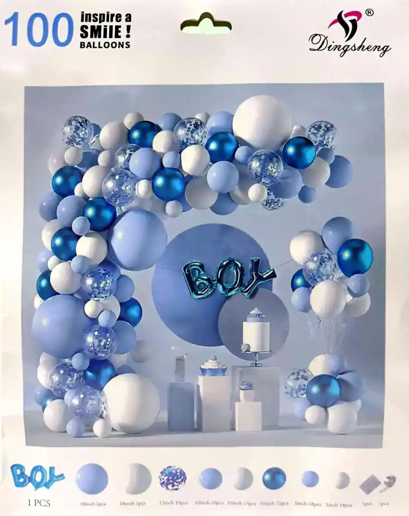 SET DE GLOBOS X100 UNIDADES INCLUYE: 1 LETRERO METALIZADO "BOY" 4 GLOBOS R18" 10 GLOBOS 12" 47 GLOBOS 10" 36 GLOBOS 5" 1 CINTA PARA ARCO 1 PUNTOS DE SILICONA