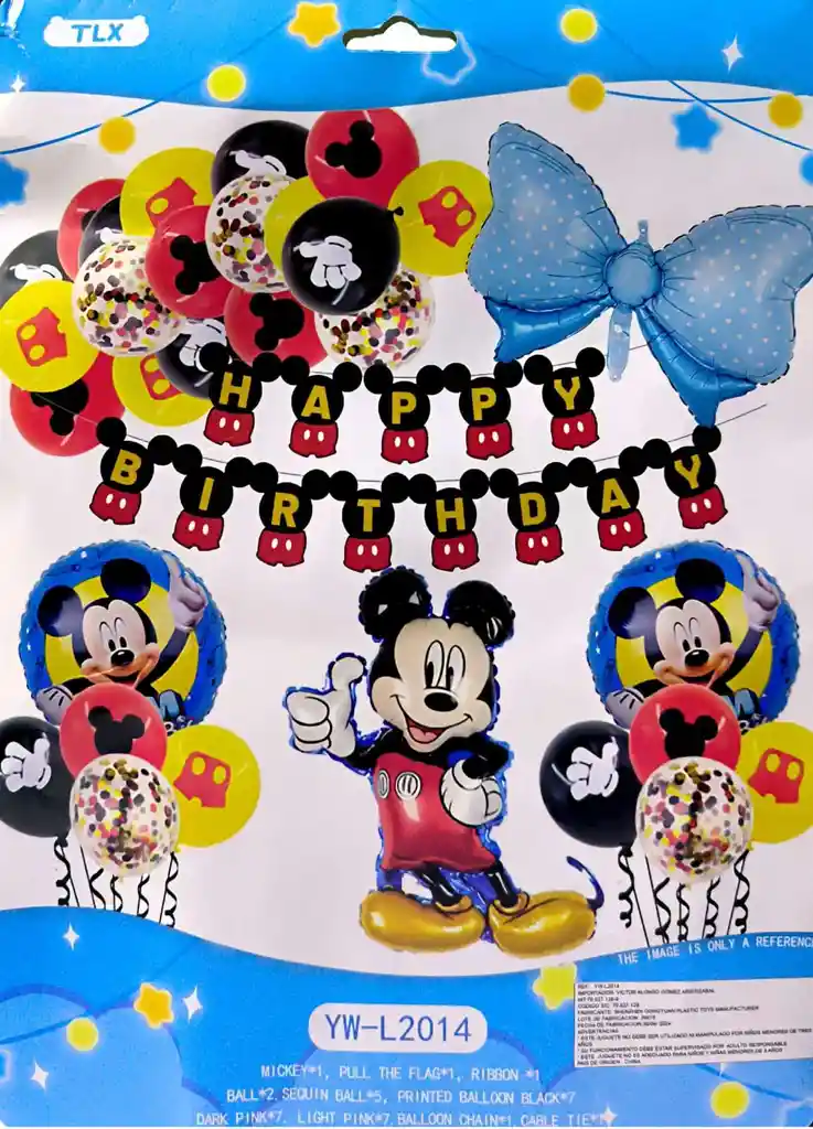 SET DE GLOBOS X33 PIEZAS "MICKY" INCLUYE: 1 GLOBO METALIZADO MICKY 30" APROX 2 GLOBO REDODONDO METALIZADO 18" MICKY 1 GLOBO MOÑO METALIZADO 30" APROX 1 LETRERO HAPPY BIRTHDAY MICKY 21 GLOBOS DE LATEX 1 CINTA PARA ARCO 1 CINTA PARA FOIL