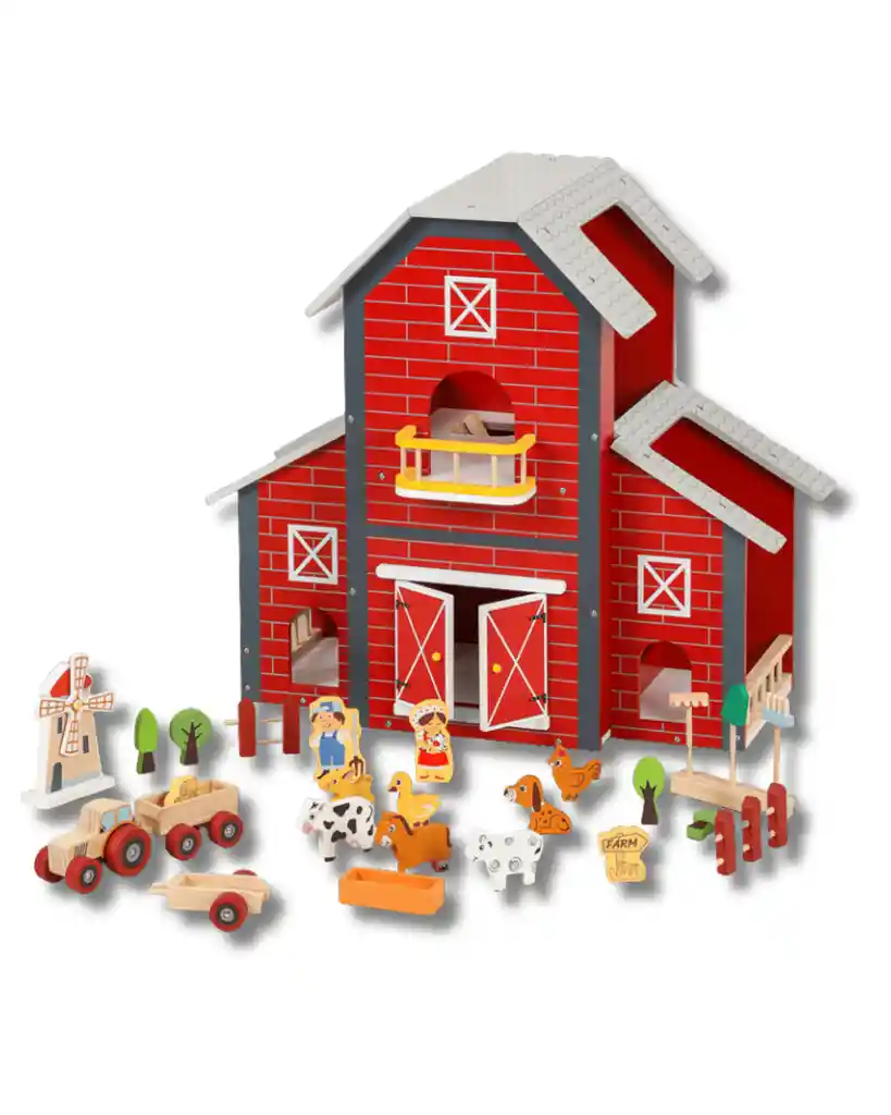 Este encantador juego de granja infantil ofrece una experiencia completa de juego simbólico con piezas de madera detalladas y coloridas. Ideal para estimular la imaginación, el lenguaje y el aprendizaje sobre la vida en el campo, este set incluye animales, personajes, vehículos y estructuras que recrean una granja real. ✨ Características destacadas: ✔ Granero principal: Estructura roja con techo gris, puertas abatibles, balcón y detalles blancos. ✔ Animales de granja: Incluye vacas, caballos, gallinas, patos y un perro. ✔ Personajes: Agricultor y granjera para enriquecer el juego de roles. ✔ Accesorios adicionales: Tractor con remolque, molino de viento, árboles, comedero y señal de “FARM”. ✔ Material resistente y seguro: Piezas de madera con acabados suaves y pintura no tóxica. ✔ Juego educativo: Fomenta la coordinación, el vocabulario, la empatía y el conocimiento del entorno rural.