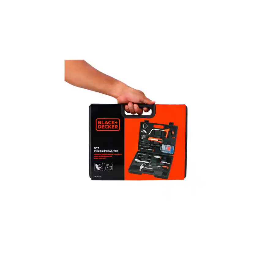 Herramientas Para Uso Manual - Set de Herramientas Manuales de 107 Piezas 1 Llave Ajustable 1 Alicate de Punta 1 Alicate Universal 1 Linterna LED 1 Cuchilla Snap-Off 1 Cinta Aislante 1 Martillo con Mango de Acero 1 Probador de Corriente 6 Dados Encastre 3 Brocas de Concreto 1 Mini arco de Sierra 8 Llaves Hexagonales 10 Puntas 1 Destornillador Ratchet Pequeño 12 Puntas de Precisión 1 Adaptador de Puntas de Precisión 56 Tornillos 1 Caja Plástica
