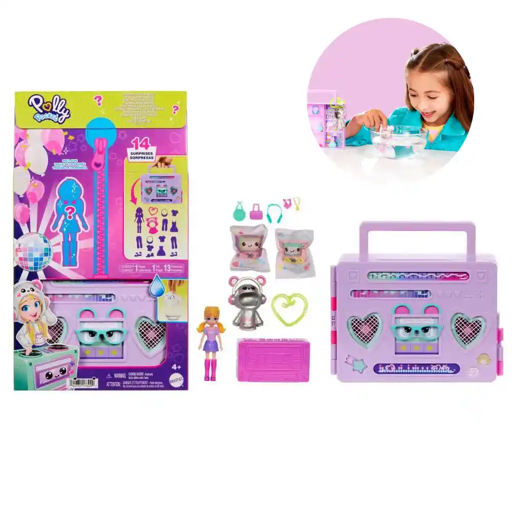 Set de Juego Fiesta Disco Fashion Reveal - Polly Pocket™ Incluye: - 1 muñeca de 3" (7,5 cm aprox.) - 16 piezas de juego Marca: Polly Pocket Referencia: HRD65 Medidas: 17.78 × 30.48 × 4.45 cm Edad mínima recomendada: 3+ ¡Prepárate para brillar en la pista con Polly Pocket™ y su Fiesta Disco Fashion Reveal! Este divertido set combina luces, ritmo y sorpresas que transforman cualquier momento en una verdadera celebración. Al abrir el playset, descubrirás una increíble fiesta escolar con cabina de DJ, arco de globos, casillero y una pista de baile giratoria. Además, incluye tres sorpresas especiales, entre ellas un sobre soluble en agua que esconde accesorios y una sudadera con capucha exclusiva con temática de DJ, perfecta para Polly Pocket™. Con su diseño colorido y detalles brillantes, esta muñeca invita a las niñas a crear historias llenas de música, diversión y amistad. (Los colores y las decoraciones pueden variar).