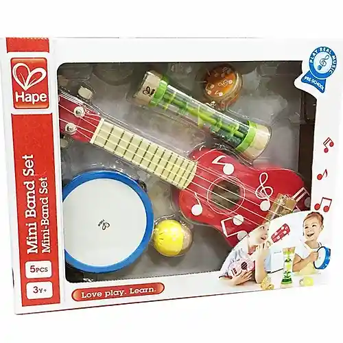 Edad 3 + Años. Este Set Ofrece A Los Niños una Variedad de Instrumentos Para Aprender y Compartir. una Guitarra, Pandereta, Castañuelas, Palo de Agua y Maraca Proporcionan la Melodía y las Armonías.