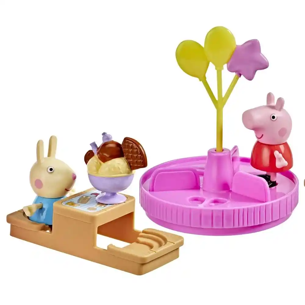 NOMBRE: Set de Juego Peppa Pig El Carrusel de Peppa REFERENCIA: G1873 ¡Imagina divertidas historias al aire libre con el set de juego El carrusel de Peppa! Este set de juego Peppa Pig de 6 piezas viene con 2 figuras de la serie Peppa Pig: Rebeca Liebre y la propia Peppa. ¡Los más pequeños podrán colocar las figuras en el carrusel y hacerlas girar y girar! Cuando termine el juego en el carrusel, podrán imaginar que Peppa y Rebeca comparten el postre helado de juguete sobre la mesa de pícnic. Inspirados en la serie animada, estos juguetes pondrán a volar la imaginación de los niños y niñas a partir de 3 años. DIVERSIÓN AL AIRE LIBRE CON PEPPA Y REBECA: Con este adorable set de juego Peppa Pig de 6 piezas, podrás imaginar aventuras diarias con Peppa y Rebeca Liebre CARRUSEL QUE GIRA: ¡Puedes colocar las figuras en el carrusel e imaginar que Peppa y Rebeca giran y giran! Coloca los globos en el centro para más diversión MESA DE PÍCNIC Y HELADOS: ¡Las figuras pueden sentarse en los bancos de la mesa de pícnic e imaginar que comparten un gran postre helado de juguete! Fabricante: Hasbro Importador: Hasbro Colombia Recomendaciones: Requiere de la supervisión directa de un adulto, puede contener partes pequeñas, riesgo de asfixia o ahogamiento, no destinar este juguete para menores por debajo de la edad establecida en la etiqueta Edad mínima sugerida: 3 Años Lote: Dato variable. Se puede verificar en el sticker que trae el producto físico. Fecha de fabricación: Dato variable. Se puede verificar en el sticker que trae el producto físico.