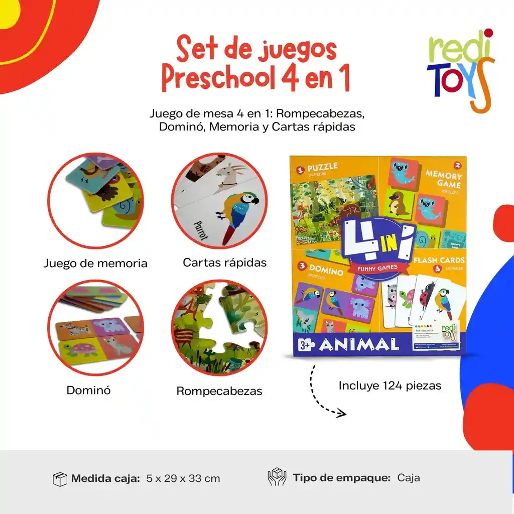 Juego de mesa 4en1, Rompecabezas, Domino, Memoria y Cartas rápidas x 124 piezas. Desarrolla habilidades psicomotoras y cognitivas, como la concentración, la memoria y la percepción visual; la coordinación viso-manual, entre otras.