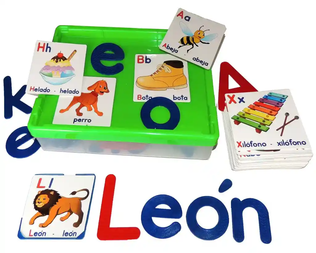 - Material: Plástico flexible 2 mm de espesor - Tamaño: Letra mas grande: 10.5 x 9.5 cm. Letra mas pequeña: 7,8 x 1.6 cm. Contenido: 1 Caja plástica con tapa 48 Tarjetas doble cara 86 Letras minúsculas 26 Letras mayúsculas - Empaque: Caja de Cartón