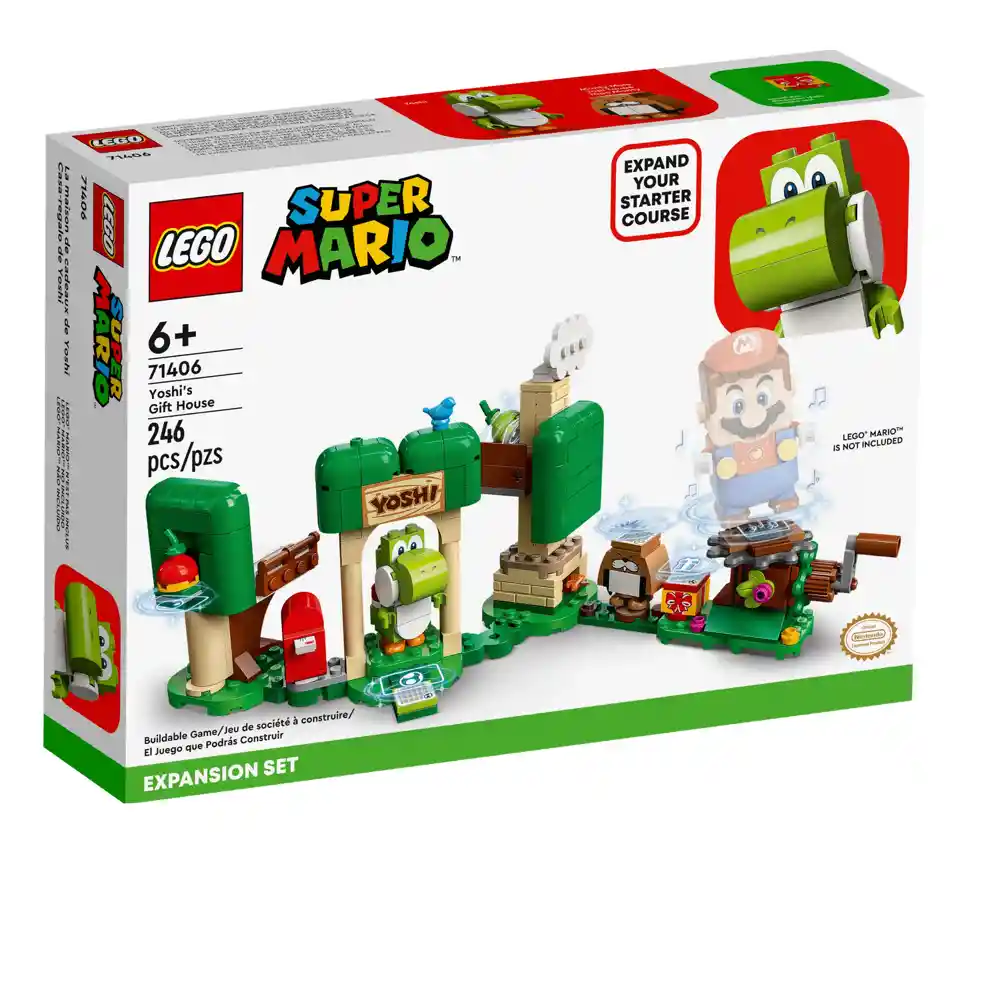 America Store te trea Set De Lego Super Mario Bross Set De Expansion 71406 Los peques pueden agregar otro divertido nivel a su mundo de LEGO® Super Mario™ con el Set de Expansión: Casa-regalo de Yoshi (71406), que cuenta con Yoshi y un Topo Monty. Los jugadores lo explorarán todo y ganarán monedas digitales con sus figuras interactivas de LEGO® Mario™, LEGO® Luigi™ o LEGO® Peach™ (no incluidas). Saluda a Yoshi en la puerta, échate una siesta en la cama de Yoshi, coge piezas de fruta, da vueltas en el carrusel de premios para que se vuelvan doradas y usa la caja de regalo para compartirlas con otra figura interactiva. O, simplemente, dale la fruta a un personaje simpático, como Yoshi. (Nota: Para jugar de manera interactiva, necesitas el pack inicial 71360, 71387 o 71403). Instrucciones de construcción digitales Este set de juguetes coleccionables, un regalo sensacional para niños a partir de 6 años, es ideal para jugar a solas o en grupo. Descarga la app LEGO Super Mario, donde encontrarás instrucciones de construcción y más contenidos superdivertidos.