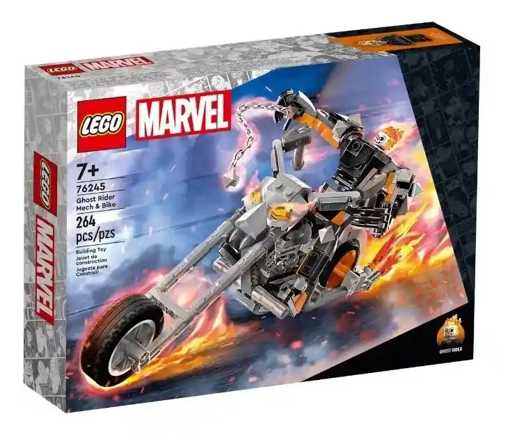 America Store te trae Set De Lego Superheroes Meca Y Moto Del Vengador Fantasma 76245 Trate a los fanáticos de los superhéroes de 7 años en adelante con mega aventuras en motocicleta con el LEGO® Marvel Ghost Rider Mech Bike a gran escala (76245). Poderosa acción mecánica, ¡sobre ruedas! Los niños colocan la minifigura LEGO de Ghost Rider en la cabina de apertura del robot Ghost Rider. El robot articulado tiene brazos, piernas y manos móviles, lo que permite posicionarlo y posarlo para infinitas posibilidades de juego y exhibición. Una cadena conectable inspira la acción imaginativa cuando los niños toman el robot de gran tamaño para dar un paseo en busca de los malos. La bicicleta se mantiene erguida sin ayuda y cuenta con llamas de escape y un elemento de asiento que asegura que el mecanismo permanezca en el sillín cuando está en movimiento. Para mayor diversión digital, la aplicación LEGO Builder presenta herramientas intuitivas de zoom y rotación que permiten a los niños visualizar su modelo mientras construyen. * Robot y motocicleta: los jóvenes superhéroes disfrutarán de un sinfín de juegos imaginativos con LEGO® Marvel Ghost Rider Mech Bike (76245), el mega robot móvil sobre ruedas. * Personaje icónico: incluye una minifigura de Ghost Rider, un robot Ghost Rider para construir con brazos, piernas y dedos totalmente articulados, y una motocicleta a escala a la que se acopla el robot.