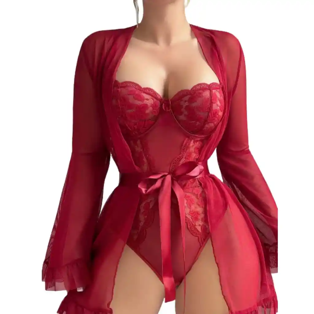 TALLA M - Body de encaje y malla transparente - Copas con varilla y encaje floral - Escote corazón que realza el busto - Diseño ajustado que estiliza la cintura - Detalles delicados en encaje y transparencia - 👘 Bata ligera a juego - Tela tipo tul o malla translúcida - Manga larga con caída suave - Cinturón de satén para ajustar en la cintura - Acabado femenino y elegante