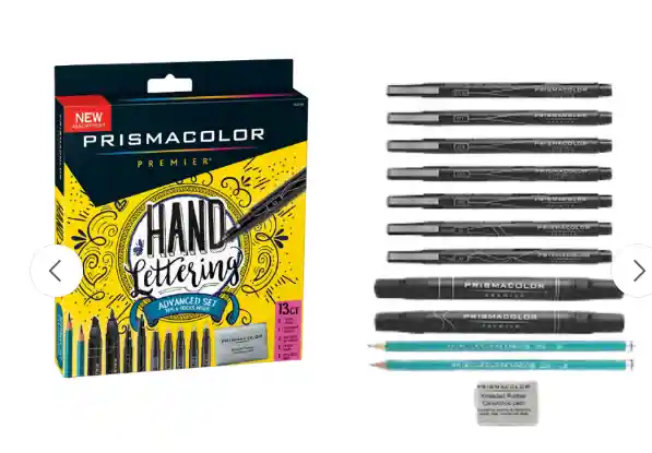 Todas las herramientas que necesita para rotulación manual avanzada: 2 lápices, 7 marcadores de ilustración, 2 marcadores de arte de doble punta, un borrador y un folleto de consejos / trucos Los lápices de grafito tienen un tendido suave que es perfecto para dibujar diseños Marcadores de ilustración en siete tipos de punta para trazar sobre grafito y agregar detalles Marcadores de arte de doble punta en cincel / fino y Cepillo / letra fina con relleno de letras y diseños El borrador de goma amasado es ideal para borrar marcas de lápiz y moldes en cualquier forma. Descripción del producto. Lleve el lado artístico de la escritura al próximo nivel con el kit avanzado de rotulación manual Prismacolor Premier. Agregando su personalidad única a cada página, el juego viene con dos lápices de grafito, siete marcadores de ilustraciones, dos marcadores de arte de doble punta, un borrador amasado y un folleto de consejos sobre cómo entregar la letra. Los lápices de dibujo en grafito 2B y 2H presentan una disposición suave que es ideal para dibujar diseños. Cuando se combina con el borrador de goma amasado, es fácil perfeccionar sus diseños. Siete marcadores de ilustración permanentes y sin sangrado en cincel, pincel y una variedad de tamaños de punta fina están diseñados para seguir sin problemas tus diseños y agregar detalles intrincados. Los marcadores de arte de doble punta en cincel / fino y pincel / fino proporcionan una rica saturación de color para hacer que las letras de las manos se destaquen. Transforme cada página en una declaración creativa con Prismacolor Premier.