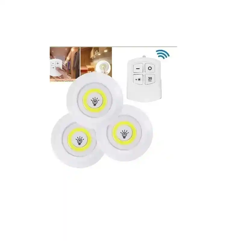 Set Luces Led X3 Control Remoto Inalambricas Juego Bombillos ESPECIFICACIONES: - Material: ABS plástico. - Luz Fría - Voltaje: 4.5v. - Tipo led: COB 3W. - Tipo de interruptor: toque o control remoto. - Mando a distancia: Control remoto. - Encendido manual: Botón pulsador. - Distancia de Control: hasta 15 pies. - Instalación: Pegatina o con Tornillos de expansión. - Temporizador: 15-30 segundos. - Cantidad de luces: 3 lámparas CARACTERÍSTICAS: Fácil de instalar, se puede instalar en cualquier lugar que desee iluminar. El control remoto permite a la lámpara ajustar el brillo y el tiempo de encendido, apagar la luz de forma inalámbrica en 30 minutos, hasta 15 pies de distancia. Si instala varias lámparas cerca, puede controlarlas todas juntas. Si instala la lámpara a una mayor distancia y separación, puede controlar una luz de forma independiente. También puedes encender/apagar la luz del disco haciendo clic en el interruptor de la Lente de la luz. Alimentado por pilas AAA (NO incluidas) para instalación inalámbrica. USOS ILUMINACIÓN: Cocinas, armarios, Mostradores, Estanterías, garajes, sótanos o lugares oscuros similares donde puede que necesite tener una fuerte iluminación constante en minutos. EL PAQUETE INCLUYE: 3x Lampara led inalámbrica. 1x Control remoto. 1x Soporte de control.
