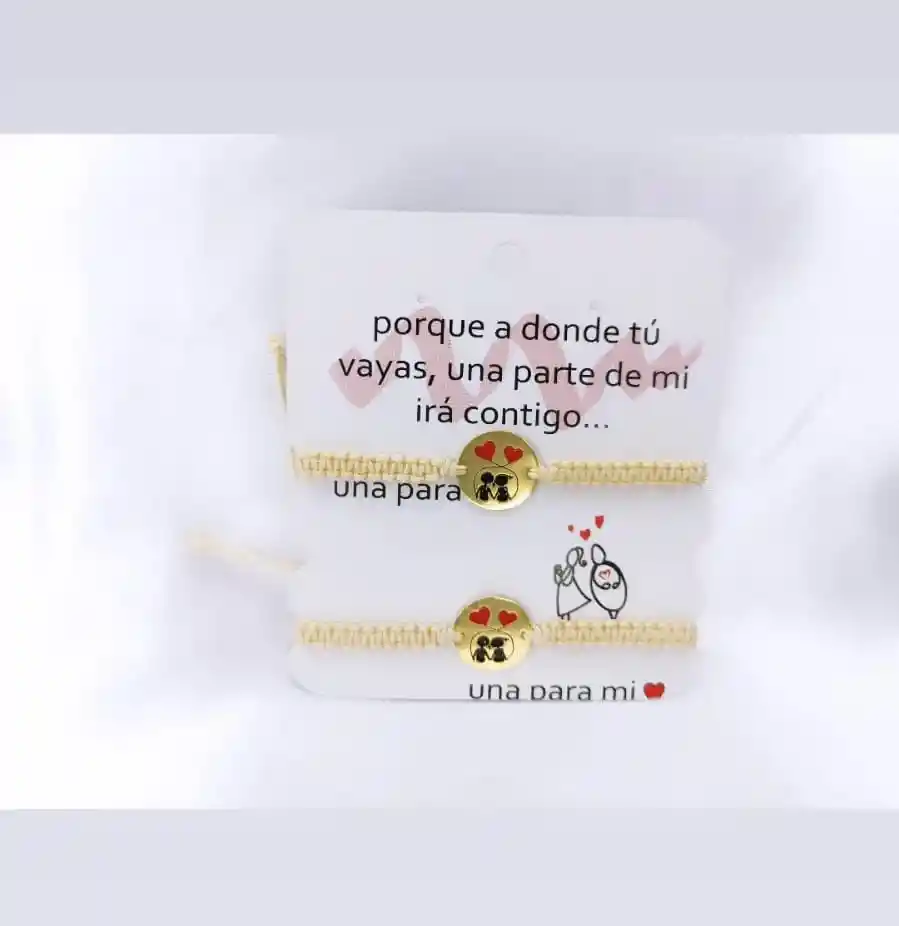 HERMOSO SET DE MANILLAS COLOR CREMA, SENCILLAS CON UNA PLACA DORADA PERFECTA PARA COMPARTIRLA CON UN SER QUERIDO