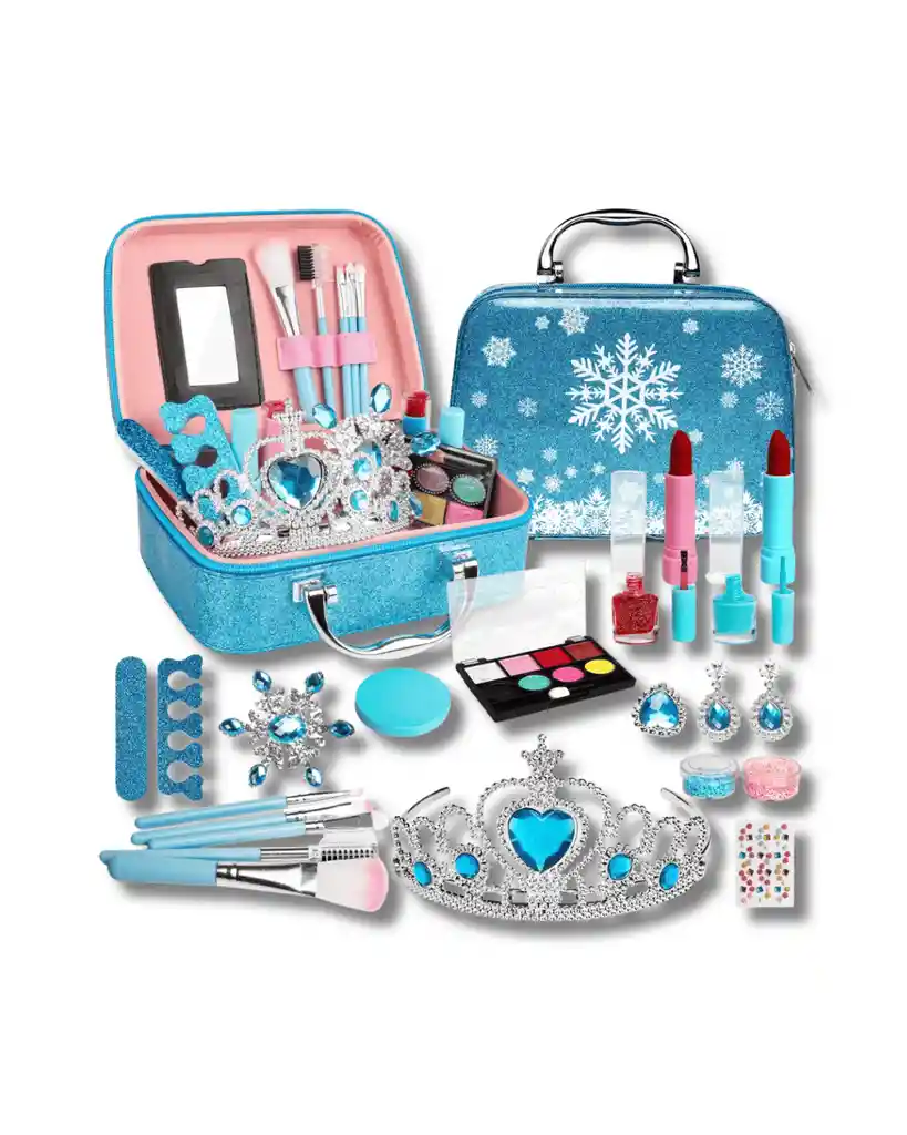 ¡Brilla como una princesa de hielo! Este completo set de maquillaje y accesorios está diseñado para fomentar el juego simbólico, la creatividad y la expresión personal en niños y niñas. Con un diseño inspirado en la magia del invierno, incluye todo lo necesario para transformar cada momento en una aventura de fantasía. ✨ Contenido del Set - 💼 Estuche azul con glitter y diseño de copos de nieve Incluye espejo interior y compartimentos para organizar maquillaje y joyas. - 💄 Maquillaje infantil seguro y lavable Sombras de ojos, labiales, esmaltes con glitter y polvos compactos para jugar sin riesgos.
