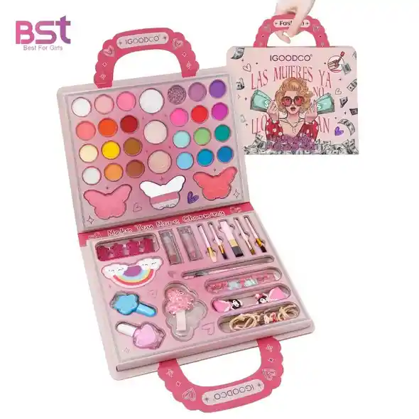 La maleta de belleza definitiva para pequeñas trendsetters. 48 piezas de maquillaje, joyería y accesorios en un diseño portátil con asa. Descripción Detallada: Este completo set de maquillaje infantil presenta un diseño de maleta con asa superior que permite transportar fácilmente todo el kit de belleza a cualquier lugar. La portada muestra una ilustración fashion de mujer con estilo retro y el lema "Las Mujeres Ya No Lloran", dándole un toque de empoderamiento y actitud único. Al abrir la maleta, se revela un interior organizado en dos niveles con 48 accesorios diferentes. La paleta superior cuenta con sombras de ojos en múltiples tonos, brillos y aplicadores en forma de mariposas. El nivel inferior alberga esmaltes de uñas, brillos labiales, brochas decorativas, accesorios de joyería y figuras de princesas coleccionables. Características Principales: Maleta portátil con asa superior para fácil transporte Diseño fashion retro con ilustración y lema empoderador 48 accesorios de belleza, maquillaje y joyería incluidos Paleta superior de sombras de ojos multicolor Aplicadores en forma de mariposa y figuras decorativas Esmaltes de uñas en botellas con formas especiales Brillos labiales y bálsamos con diseños divertidos Brochas de maquillaje con mangos decorativos Accesorios de joyería: pulseras, collares y figuras de princesas Corona de princesa con brillantina incluida Cierre seguro y estructura rígida protectora Incluye en la Caja: 1 Maleta de maquillaje IGOODCO con asa portátil Paleta de sombras de ojos multicolor (tonos pastel y vibrantes) Aplicadores de sombra en forma de mariposa Esmaltes de uñas en botellas con formas de estrella y corazón Brillos labiales en tubos decorativos Bálsamos labiales con diseños de arcoíris y nubes Brochas de maquillaje con mangos coloridos Corona de princesa con brillantina rosa Pulseras y collares de cuentas Figuras de princesas coleccionables Accesorios de aplicación con formas divertidas
