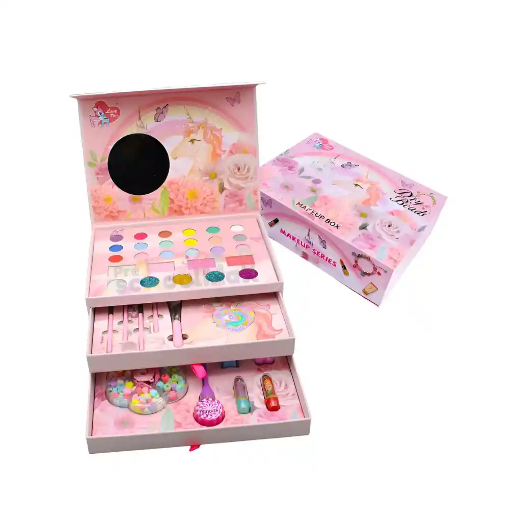 Eleva la imaginación y creatividad de las niñas con este elegante Set de Maquillaje Infantil Unicornio, un estuche de lujo tipo libro que combina colores brillantes, accesorios completos y un diseño encantador. Ideal para niñas que disfrutan del juego creativo, el maquillaje seguro y las actividades manuales. Descripción del Producto Este set incluye una amplia variedad de sombras, labiales, brillos y accesorios diseñados especialmente para pieles delicadas. Todo está elaborado con fórmulas no tóxicas, lavables y seguras, permitiendo que las niñas jueguen y experimenten sin preocupaciones. El estuche tipo libro cuenta con un diseño de unicornio, espejo integrado y cajones organizadores que facilitan el uso y almacenamiento. Características Principales Estuche tipo libro resistente, con diseño de unicornio y cierre imantado. Paleta completa con sombras mate y brillantes en tonos vibrantes. Labiales, brillos y rubores de fácil aplicación. Juegos de brochas suaves para maquillar con precisión. Accesorios adicionales como anillos, peinillas y herramientas decorativas. Fórmula no tóxica y lavable, apta para niñas. Organización por compartimientos para mayor orden y comodidad. Espejo incorporado para una experiencia realista. Forma de Uso Abrir el estuche y seleccionar los colores deseados. Aplicar maquillaje con las brochas incluidas, de manera ligera. Retirar fácilmente con agua y jabón después del juego. Guardar los accesorios en los cajones para mantener todo en perfecto estado. Recomendaciones de Uso Utilizar bajo supervisión de un adulto en niñas pequeñas. Evitar contacto con ojos y boca en exceso. Hacer prueba en una pequeña zona de la piel antes de uso prolongado. Mantener el estuche cerrado cuando no esté en uso para proteger el maquillaje. Condiciones Óptimas de Conservación Guardar en un lugar fresco y seco. Mantener alejado del sol directo y del calor intenso. Limpiar las brochas después de cada uso para prolongar su vida útil.