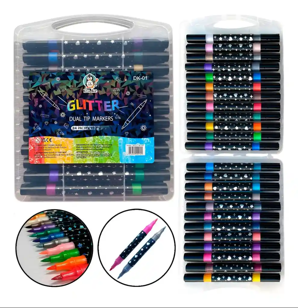 Características: - colores con purpurina para tus creaciones artísticas y escolares; - Punta de doble pincel de 0,9 mm: trazos expresivos y suaves; - Trazos de 2 mm, perfectos para detalles y rellenos; - Estuche de plástico transparente, práctico y resistente; - Tinta de secado rápido y larga duración; Perfecto para quienes buscan color, brillo y creatividad. Contiene: 1 estuche con 24 marcadores de doble punta con purpurina en 48 colores.