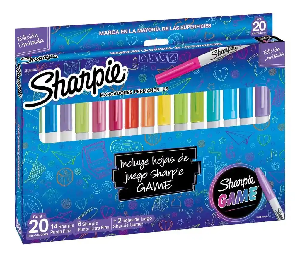 DESCRIPCIÓN DEL PRODUCTO Set de marcadores permanentes Sharpie Game x20 La marca Sharpie te trae el set de marcadores punta fina con los colores que te encanta para decorar tus tarjetas y demás artículos para darle tu toque personal y porque no, pasar momentos agradables jugando con tus mejores amigos. CARACTERÍSTICAS - COLORES VIBRANTES: los marcadores Sharpie, hacen que tu imaginación vuele, te inspiran a transformar espacios y convertir superficies cotidianas en expresiones de tu creatividad, pasión y gustos. - TRAZOS DELICADOS: cuenta con una punta fina, que permite la distribución adecuada de la tienta logrando trazos finos en todo momento. - SEGURIDAD: su tinta posee componentes que generan un secado óptimo en tiempo reducido, lo que asegura que no se va a correr el trazo. Seguro para uso de niños. - Incluye: - 14 marcadores punta fina, colores variados. - 6 marcadores punta ultra fina, colores variados. - 2 hojas para colorear.