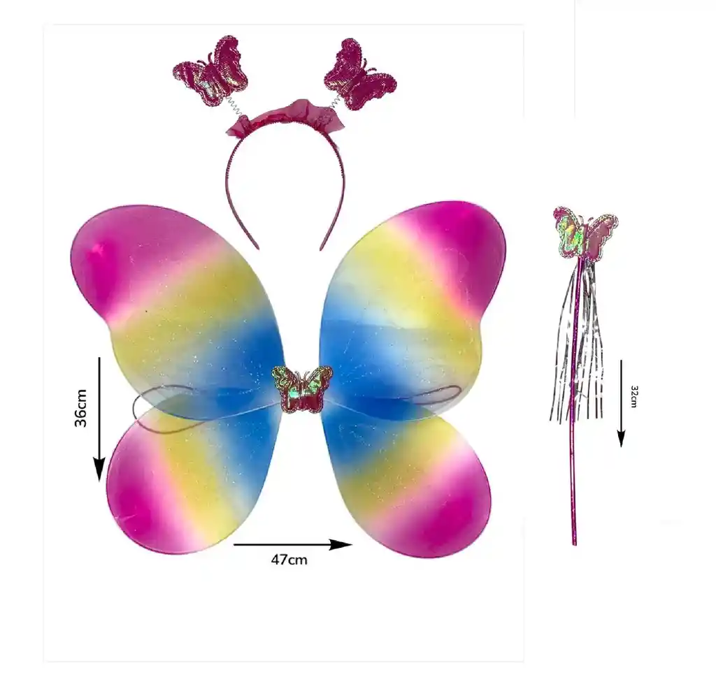 SET DE MARIPOSA 3 PIEZAS ALAS, DIADEMA Y CETRO REF 0169 HALLOWEEN. Sus medidas aproximadas son ALAS: 36 cm de alto x 47 cm de ancho. CETRO: 32 cm alto.