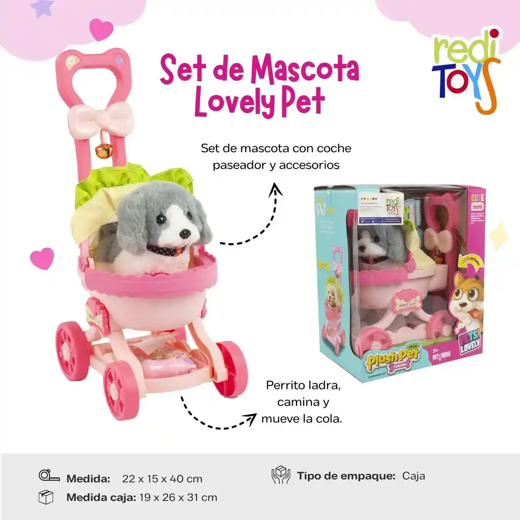 Set de mascota con coche paseador y accesorios, con movieniento y sonidos Perrito ladra, camina y mueve la cola. Experimenta una variedad de actividades y cuidados con tu mascota. Anima a los niños pequeños a desarrollar habilidades sociales y de responsabilidad. Elaborado con material ABS seguro y de alta calida