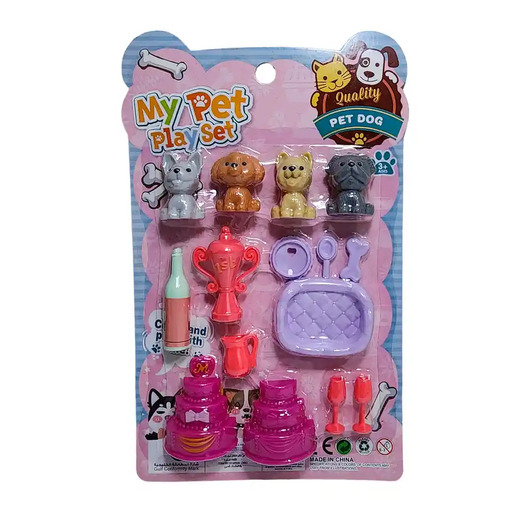 ¡Prepara la celebración más adorable y organiza la fiesta del año para tus cachorros con nuestro encantador "My Pet Play Set"! Este completísimo set de juego viene con cuatro adorables y diferentes figuras de perritos, listos para ser los invitados de honor en cualquier evento que tu imaginación cree. Celebra su victoria en una exposición canina con el brillante trofeo, sírveles una deliciosa rebanada de pastel de dos pisos y brinda por la diversión con las copas y la botella de celebración. Después de la fiesta, podrán descansar cómodamente en su elegante camita. Es el regalo perfecto para los pequeños amantes de los animales, fomentando el juego de roles y la creación de un sinfín de historias y fiestas inolvidables para estas tiernas mascotas. Ficha Técnica: Dimensiones del empaque : 25 cm x 15 cm Material : Plástico ABS Edad apta para jugar: + 3 años Referencia: CA1210 Certificado de conformidad: SL-CS-210044 ** _Para defectos de fábrica o retractos: \_Por favor revise el producto apenas lo reciba y antes de usarlo. No aplican ley de retracto o defectos de fábrica luego de usar el producto. Se manejan máximo 5 días para reportar defectos de fábrica (por ejemplo, producto funciona mal, piezas faltantes, rotas, etc). Para hacer efectiva la devolución el producto debe devolverse con el empaque original, el cual debe estar en buen estado, incluir todos los documentos y las partes completas y sin daños.