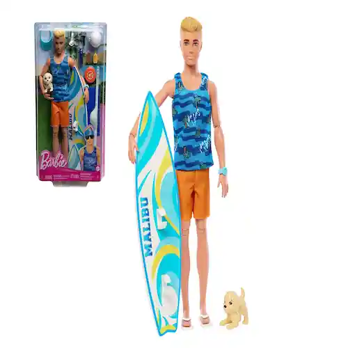 America Store te trae Set De Mueñeco Ken Divertida Tabla De Surf De Mattel HPT50 Vamos a una aventura en el mar con Ken con una tabla de surf. Ken viste un top con estampado de palmeras y un traje de baño de pantalón naranja, completo con sandalias blancas y su cachorro mascota. La tabla de surf MALIBU se puede fijar con un clip y las 11 articulaciones se mueven. También se encuentran disponibles accesorios como pochettes, toallas, frisbees, anteojos de sol, viseras, botellas de agua, protectores solares, cámaras deportivas, relojes, pelotas, paletas heladas.