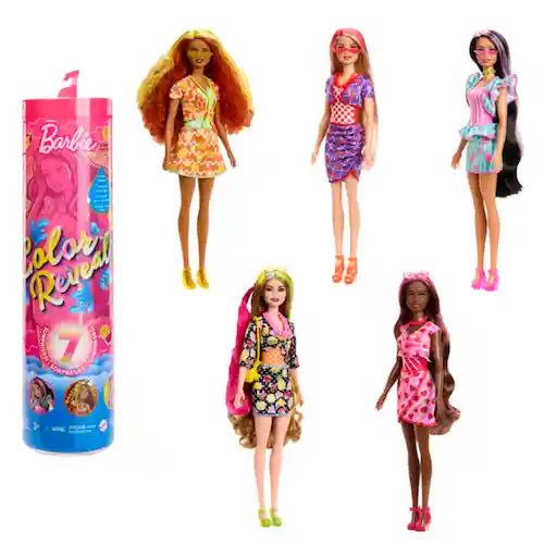America Store Te Trae Set De Muñeca Barbie Color Reveal Sweet Fruit Hlf83 Las muñecas Barbie® Color Reveal™ brindan una experiencia de desempaquetado con siete sorpresas, incluida una muñeca Barbie® perfumada cubierta con una capa de frutas mixtas cuyo aspecto se revela con agua. Con la serie Sweet Fruit, los niños encontrarán una de las cinco muñecas posibles, cada una con un aroma afrutado como cerezas, sandía, fresas, piña y limón cítrico, además de ropa y accesorios con temas de frutas escondidos en las cuatro bolsas misteriosas. Los efectos de cambio de color en los ojos y labios de la muñeca Barbie® agregan más sorpresa. ¡Los niños pueden buscar la muñeca rara que viene con un bolso adicional y una extensión de cabello rosa brillante para mezclar y combinar aún más! Utilice el tubo de embalaje para guardar estos y otros accesorios. ¿Qué muñeca revelarás? Cada uno se vende por separado, sujeto a disponibilidad. Las muñecas no pueden estar solas. Los colores y las decoraciones pueden variar.