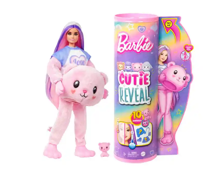 America Store te trae Set De Muñeca Barbie Cutie Reveal Cozy Osito HKR04 Detalles del producto Abrir la caja de las muñecas Barbie Cutie Reveal Cozy Cute Tees será una experiencia espectacular. ¡Hay diez sorpresas diferentes! Descubre a un achuchable osito rosa que lleva una camiseta con la palabra “Love” bordada. Quítale el disfraz de peluche y descubrirás una muñeca Barbie articulada con una larga y colorida melena. Acomódate y descubre más sorpresas, como una diadema, una falda satinada y una minimascota a juego. Dale la vuelta a la parte superior del disfraz de peluche para convertirlo en una chaqueta polar y usa la cabeza como una cama para mascotas. El agua muy fría hace que el pelo de la muñeca y la minimascota sean aún más adorables, ya que cambian de color, y el agua caliente los devuelve a su color original para que la diversión se repita. A niños y niñas les encantará descubrir todas las encantadoras sorpresas de la serie más cómoda y adorable de Barbie Cutie Reveal. Incluye una muñeca vestida con un disfraz de animal y 10 sorpresas.