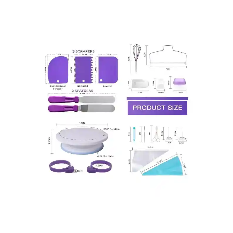 Kit De Pasteleria Juego De Decoracion Tortas Ponques Pasteles Gran juego de pastelería profesional todo en uno, equipo reutilizable y aprovechable, que proporciona los elementos suficientes para impulsar tu imaginación en el arte de la repostería. Nuestro paquete de materiales de decoración incluye rasquetas, boquillas, una jeringa y cortador de pasteles, uñas de flores, levantador de flores, cepillo recto, bolsas desechables y muchos más artículos imprescindibles que te encantará aprender a perfeccionar y dominar. Nota: El obsequio no es objeto de garantia ni de devolucion Dimensiones: -Raspadores: 4.7 pulgadas x 3 pulgadas -Espatulas: 10 pulgadas -Base: 10 pulgadas x 2.75 pulgadas -Batidor: 10 pulgadas -Cortador: 12 pulgadas x 6.5 pulgadas -Mangas: 6.57 pulgadas x 10.51 Características: Material: -Silicona, acero inoxidable, plástico. -El plato giratorio para tartas con antideslizante está hecho de material de calidad alimentaria y libre de BPA. Contenido Caja -1 cortador de tartas: fuerte y duradero, embalaje curvado. -3 raspadores para tartas: superficie lisa, diseño de agujero para colgar. -1 plato giratorio antiadherente: Puede sostener un pastel de hasta 11.0 in e incluso puede acomodar un pastel más grande en una tabla de tartas, 2.75 pulgadas de alto tiene un borde antideslizante. -2 bolsas de repostería reutilizables de silicona: Úselo, lávelo y está listo para usar de nuevo. -30 bolsas de glaseado desechables -1 espátula de glaseado (10.2 in). Úselo para desplazar y extender el glaseado de manera uniforme. -1 espátula de glaseado en ángulo (10.6 pulgadas). -1 tijera para levantar flores. Transfiere fácilmente flores de uñas a torta sin daños. -14 sellos de fondant para moldes Fantang. -1 clavo de flor grande: Las uñas de flores son una forma popular de crear flores para pasteles de boda y pasteles. -1 clavo de flor pequeña. -5 Cucharas medidoras: con un cuarto de cucharadita, media cucharadita, una cucharadita, media cucharada. y una cucharada, con mililitro (ml) equivalentes. -1 bolígrafo para pastel: Llénalos con glaseado, aplica una presión uniforme y comienza a decorar como un bolígrafo normal. -1 cepillo de limpieza: no estropee sus manos consejos de limpieza. Use el cepillo de limpieza para eliminar el glaseado de las tapas estrechas. -1 acoplador de color. -2 boquillas para pastel. -55 puntas de glaseado de acero inoxidable. -1 caja de almacenamiento: Para el almacenamiento de puntas de glaseado inoxidables. -1 batidor: Alambre de acero inoxidable pulido. -2 lazos para bolsas de pastelería. -1 gráfico de patrones impresos. Recomendaciones: - La garantía no cubre el mal uso del producto -Para lavar los utensilios, «modo limpieza profunda», sólo necesitas agua caliente y detergente líquido para vajillas -Puede haber alguna diferencia de tono entre la imagen y el producto real, debido al tratamiento de la imagen y la calibración del color de su monitor. -Las imágenes son meramente ilustrativas, no acompañan objetos decorativos y electrónicos. Condiciones generales para devolución: Te aceptamos aquellos productos afines a cambio o devolución siempre y cuando se encuentren en las siguientes condiciones: El producto no debe mostrar señales de uso, suciedad o desgaste. El producto no debe tener más de (48) horas hábiles de entregado. El producto no debe estar averiado o deteriorado. El producto debe contener las correspondientes etiquetas, accesorios y empaques. Originales (incluyendo manuales, guías de uso, certificados de garantía, etc.)