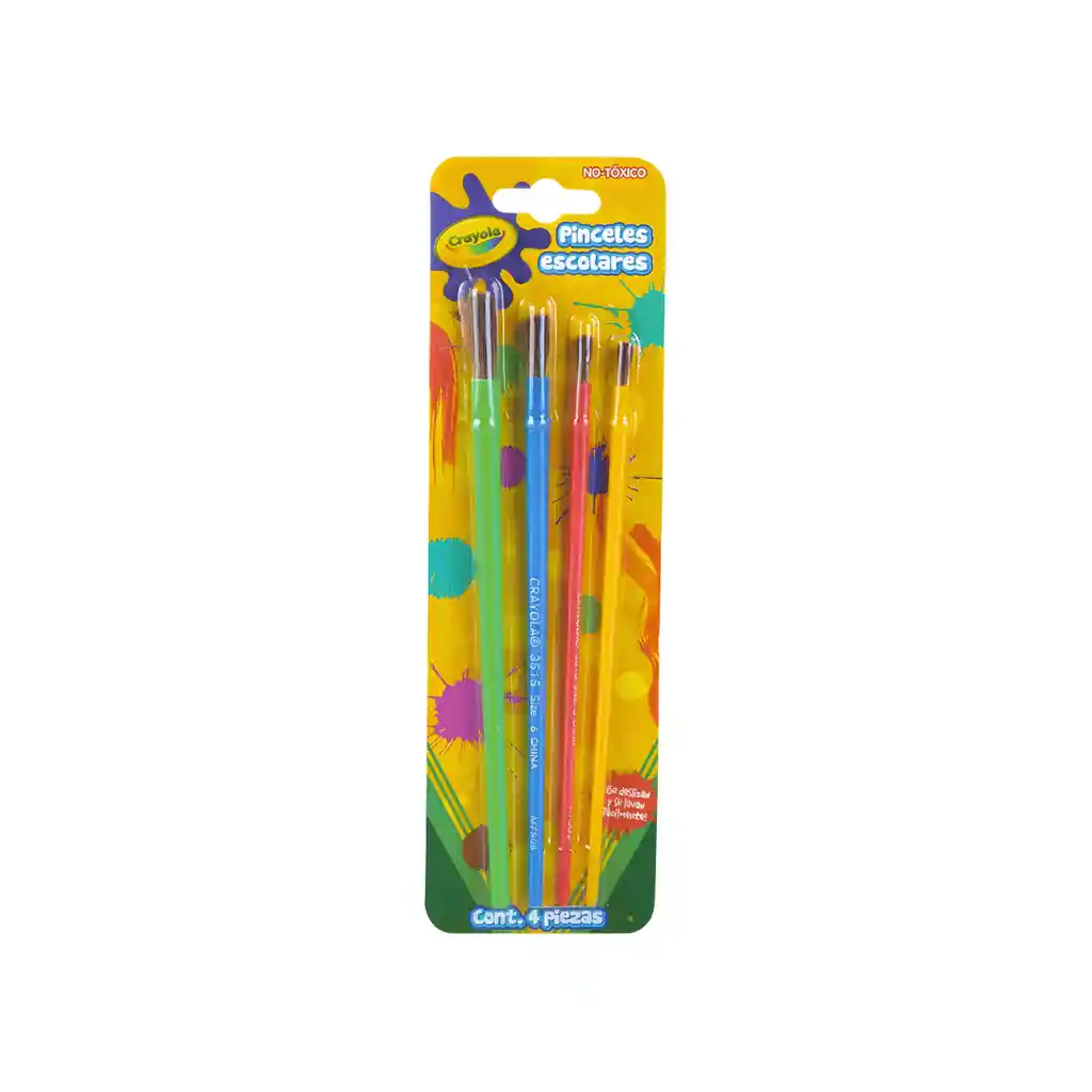 Set de 4 pinceles Crayola con mangos de colores y cerdas suaves. Perfectos para actividades escolares, artísticas y manualidades.