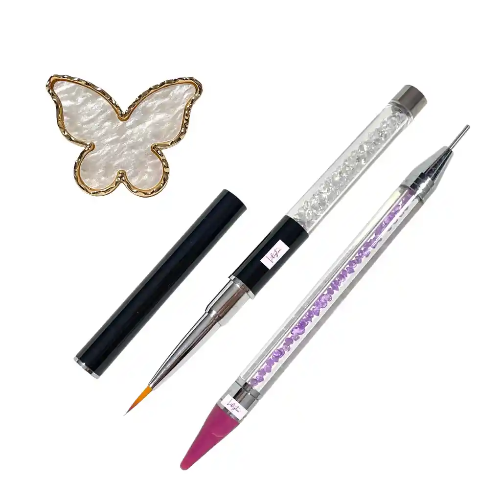 Set de Lujo para Decoración de Uñas Nail Art Incluye: - 1 pincel delineador con tapa (Mango negro, piedras blancas) - Puntero doble punta (piedras moradas) - Paleta mezcladora blanca en forma de mariposa. Características destacadas: - Diseño elegante, práctico y portátil - Viene con tapa para proteger el pincel del polvo y estuche para proteger el puntero. - Anillo fácil de limpiar, sin manchas. No habrá mezcla de colores, teñido, conveniente y fácil de usar. - Ajuste de tamaño del anillo: El anillo se puede ajustar, por lo que no tienes que preocuparte por el tamaño. Simplemente ajusta el anillo al tamaño adecuado para tu dedo.. Set ideal y práctico para trabajos de Nail Art. Adecuado para estudiantes de arte de uñas o profesionales en casa o uso profesional. En Lifeglow Store, iluminamos tu vida con productos que inspiran y potencian tu bienestar.