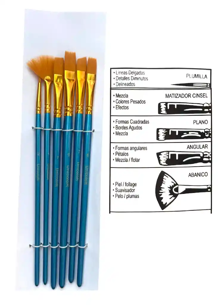 Ideal para acuarelas oleos y acrilicos. Se envían 6 unidades en tamaños surtidos. Tamaños: 1 Plumilla #2, 1 Abanico #4, 1 Agular #7, 2 Plano #6 y #9, 1 Matizador cinsel #9.