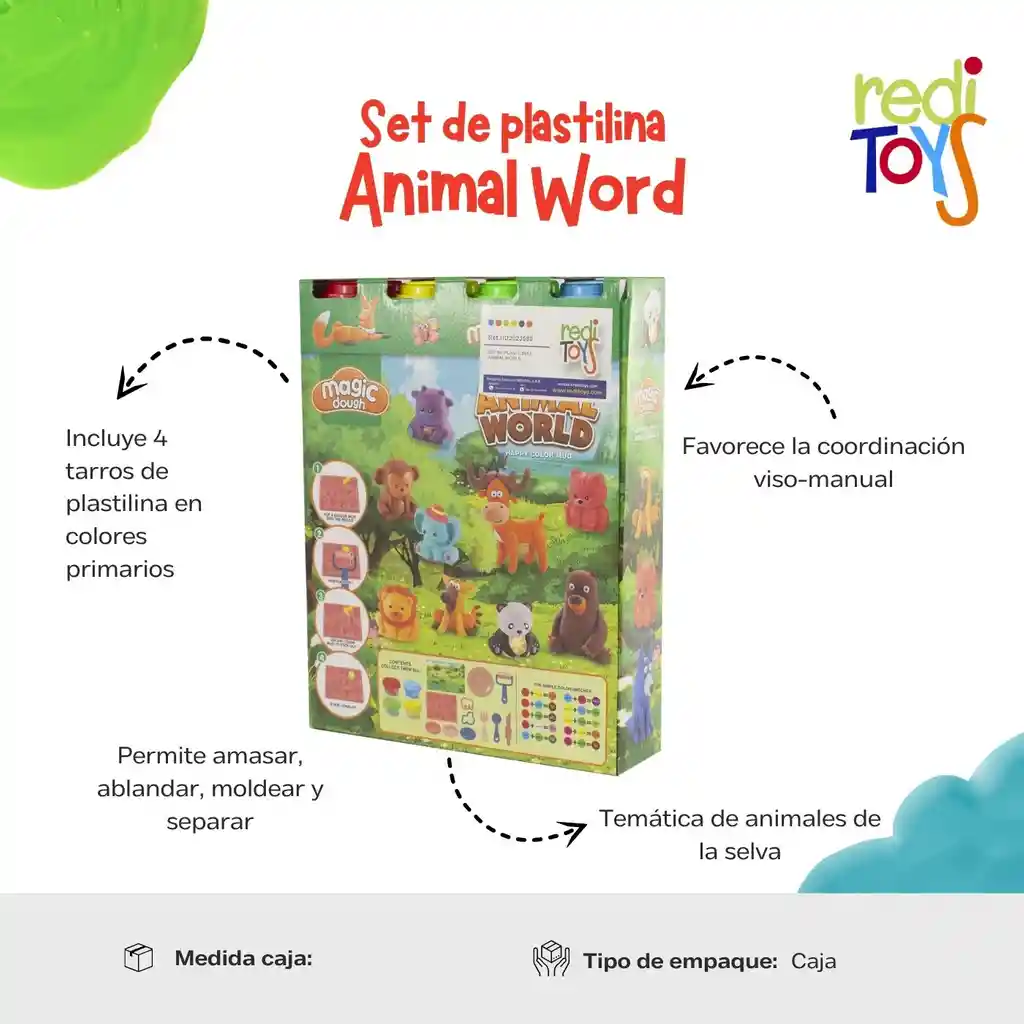 Set de plastilina animales de la selva, con 4 tarros de plastilina de colores primarios. Ayuda a desarrollar habilidades manuales como amasar, ablandar, moldear,ceparar y volver a unir. Mejora la coordinación viso-manual e insentiva la imaginación creativa.