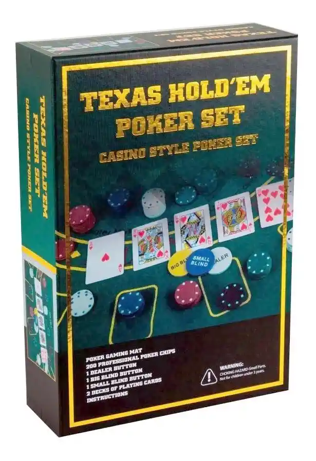 Disfruta con tu familia o amigos con el popular juego de Poker Texas Hold'em.Es un juego fácil de aprender, pero tiene el potencial de jugarse en una aparentemente infinita variedad de estrategias, tácticas y matices.Contiene:-Tapete Black Jack-200 fichas de póker profesional-2 barajas-1 ficha repartidor (Dealer)-2 fichas de apuesta (Big Blind - small blind)-Manual de instrucciones