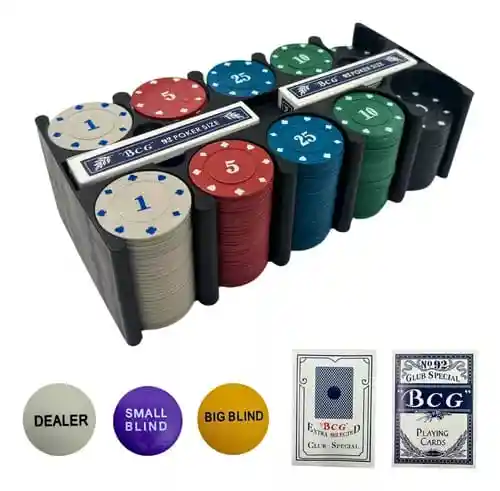 Set De Poker Tipo Casino Texas Hold`em Porta fichas para 200 piezas. Tapete de juego Black Jack 55 x 90 cm 200 fichas 4 cm de diametro barajas de cartas estandar. 3 botones (Dealer, Big Blind y Small Blind). 24cm x 11,5cm x 11cm