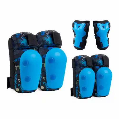 es un kit de seguridad diseñado principalmente para niños y jóvenes que practican deportes de ruedas como patinaje, ciclismo o skate. Este conjunto se caracteriza por su diseño ergonómico y materiales resistentes para absorber impactos. El kit incluye un total de 6 piezas de protección 2 Rodilleras: Para protección frontal de las piernas. 2 Coderas: Para resguardar los codos ante caídas laterales. 2 Muñequeras: Con diseño antifractura para proteger las manos y muñecas Materiales: Carcasa exterior de plástico rígido (PVC o PP) de alta resistencia para resistir raspones y deslizamientos. Acolchado: Interior de espuma (EVA o aglomerada) de alta densidad que proporciona confort y amortiguación ante golpes. Sistema de Ajuste: Correas elásticas con cierre de velcro, permitiendo un ajuste firme y personalizado según la contextura del usuario. Transpirabilidad: Fabricado con telas ventiladas o malla de aire para reducir la acumulación de sudor durante la actividad física.