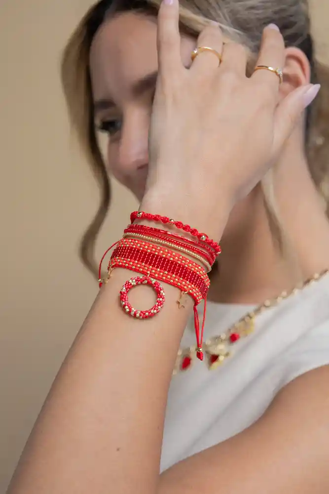 Set de pulsera tejida en mostacilla y balines, con nudo corredizo. Dijes y acabados en Oro Goldfilled Brasilero. Incluye: 1 set de pulsera roja dorada. Incluye aretes tipo topos (aretes pequeños), el diseño del arete te llegará según disponibilidad. Recibe con tu compra una FLORIBAG gratis, para que guardes por separado tus accesorios. Hecho a mano en Colombia. * Las imágenes pueden estar ambientadas con otros productos que se venden por separado