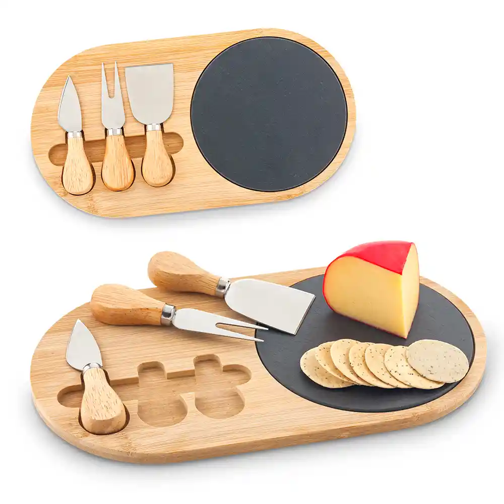 Set de Queso Base ovalada en madera, con piedra y tres accesorios para quesos en acero inoxidable. Empaque Caja Individual. Medidas: Base: 32.5 cm x 17.5 cm x 0.9 cm.
