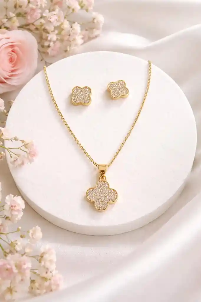 Set de rodio aretes cadena y dije de trebol en circones blancos